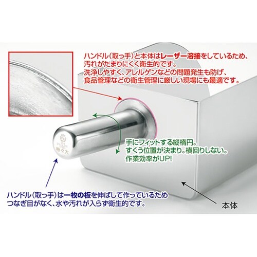 粉末、薬剤、飼料など、幅広い分野で使用できるスコップです。底が平らで、台の上の粉もきれいにすくえます。 |