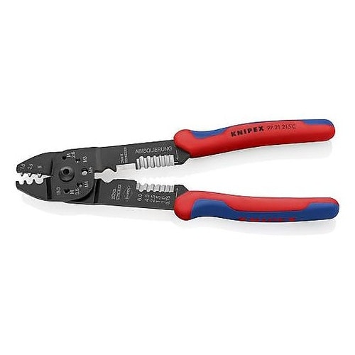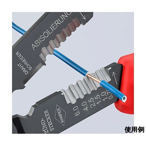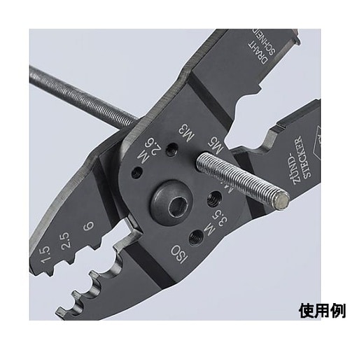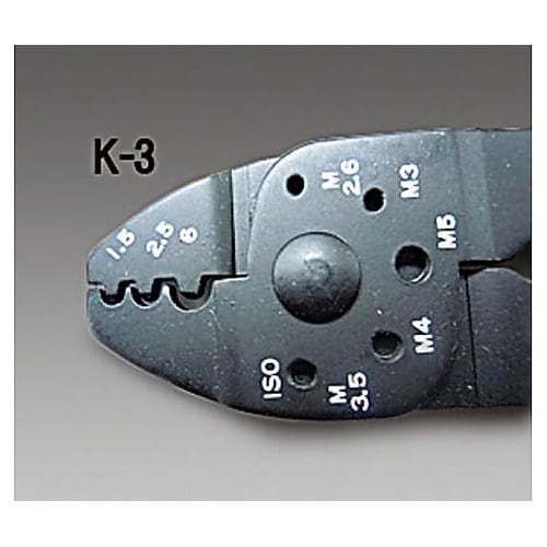 ケーブルの切断、ワイヤーの皮むき、端子の圧着が行えます。ねじ径M2.6、3.0、3.5、4.0、5.0の銅・真鍮製のねじを切断できる穴が開いています。 |