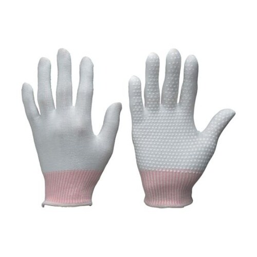 シリコン樹脂をドット加工することにより、すべり止め効果を発揮します。低発じんで、通気性に優れた耐切創手袋です。使い捨て手袋のインナーとして使用すると、アウター手袋がずれ落ちることを防ぎます。すべり止め |
