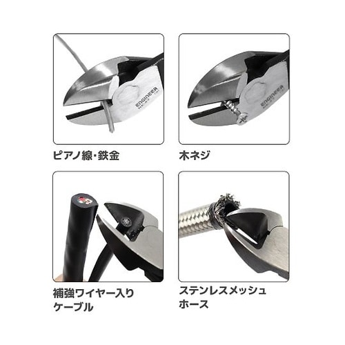 切断力と耐久性に優れた強力ニッパー。刃は高強度で耐久性に優れています。コースレッドや高硬度なピアノ線も切断できます。電線や鉄線、ピアノ線の切断に。突き抜けたクギ、木ネジの処理に。工場内配線や架空配線に