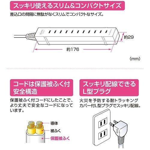 無駄のないスリム設計ACアダプターを複数差せる。電気火災を予防コードは保護被ふく付安全構造スッキリ配線できるL型プラグ |