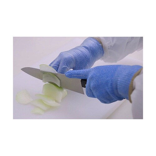 高強力ポリエチレン繊維の編み手袋を使用していますので、耐切創性に優れています。下履きに適した薄手タイプの耐切創手袋です。発塵性の低い長繊維を使用しています。次亜塩素酸洗浄、殺菌による繰り返し使用が可能 |