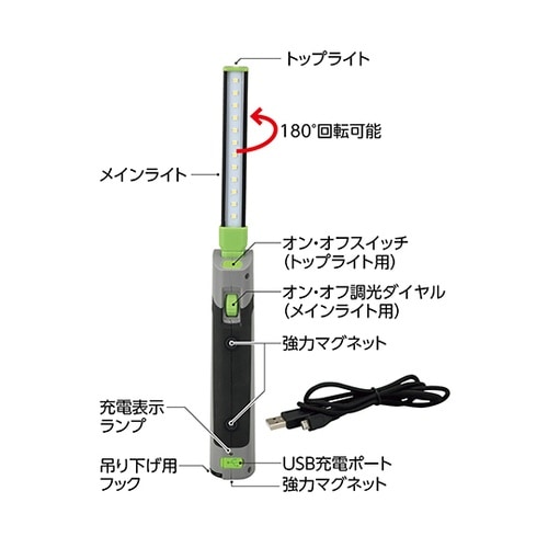 明るさをフレキシブルに調整できるダイヤル式調光スイッチ付のLEDライトです。底部と側面のマグネットは非常に強力で、折りたたみ式でコンパクトに収納できるため、あらゆるシーンで活用します。400lmのメイ |