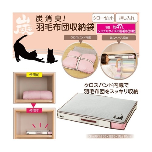 クロスバンド内蔵で羽毛布団をスッキリ収納できます。天面と底面に消臭効果のある炭シートを通気性の良い不織布で挟んで使用しています。ケースに透明窓をもうけ中身が分かる仕様です。シングルサイズ羽毛布団が1枚 |