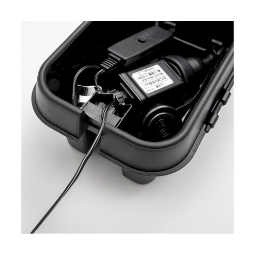 耐水性の屋外用コンセントボックス。ガーデンライトなどのコードをすっきり収納できます。水やホコリの侵入防止に。結束バンドで固定ができるので、いたずら防止ができます。