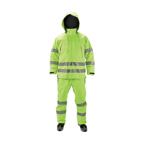 (株)前垣との共同開発によるゴアテックス高視認制電レインスーツです。高視認性安全服JIS T 8127規格適合 Class3のレインスーツです。最高クラスの視認性で夜間の作業中でも危険を回避します。制 |
