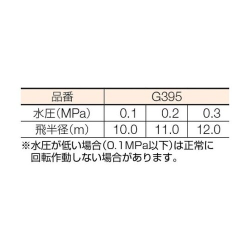 耐久性の高いメタルタイプのスプリンクラーです。円形に散水ができます。水圧が0.1MPa以下の場合、正常に回転作動しないことがあります。使用条件や水圧、流量等により散水状態は変わります。散水用。 |