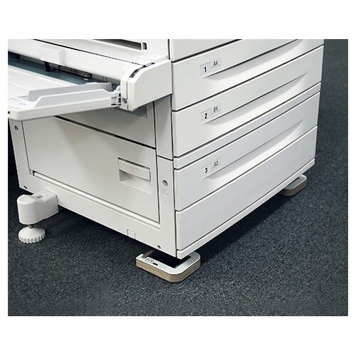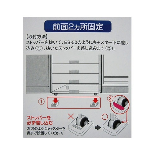 差し込みストッパー付でキャスターの逃げ防止に使えます。両脇に書庫などがあって後方の設置がしにくい場合に対応できます。前面2か所のキャスターの設置でOKです。キャスター下に差し込みストッパーを装着し使用 |