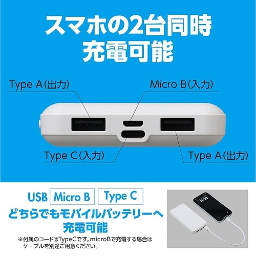 急速充電対応の大容量モバイルバッテリー本体への充電はMicroB、Type Cのどちらでも可能スマホの2台同時充電可能 |