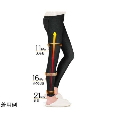外でも、家でも、パジャマでも、好きな時に着用可能な着圧レッグウェア段階圧力設計ではいてる間中美脚ケア首21hPa、ふくらはぎ16hPa、太もも11hPaお腹まわりはゆったり設計で就寝時も快適ストレッチ |