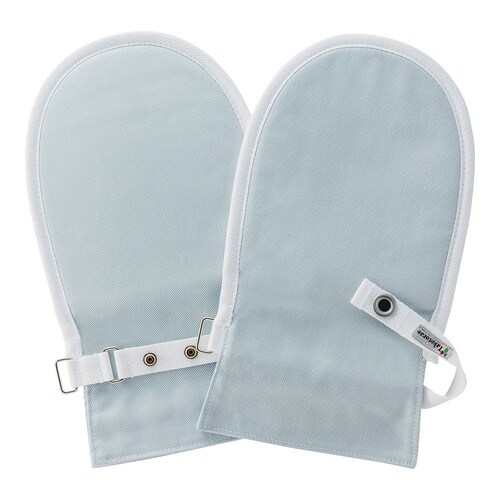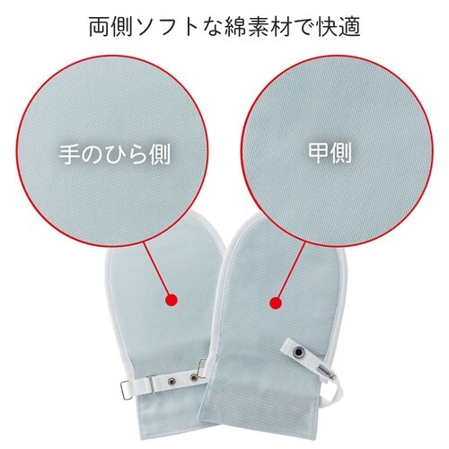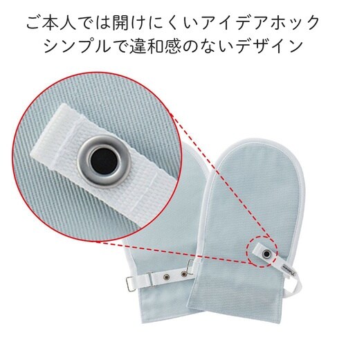 ご本人には外しにくい構造のアイデアホックを採用しています。両面綿タイプで、てぶくろの中はゆったりしているので、手指の動きを妨げません。