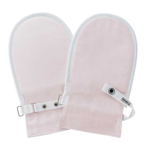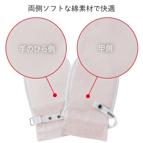 ご本人には外しにくい構造のアイデアホックを採用しています。両面綿タイプで、てぶくろの中はゆったりしているので、手指の動きを妨げません。