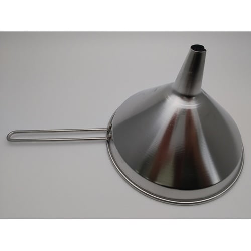 扱いやすいハンドルのついたじょうご(ロート)です。先端口は液体がスムーズに下に落るよう、ハート形の段押し加工を施しております。本体ハンドル共に18−8ステンレスを使用しており、錆に強くとても衛生的です |