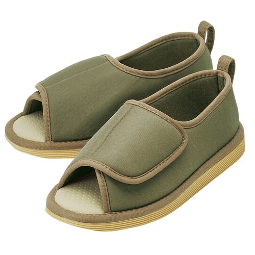 ちょっとした段差や滑りやすい床での転倒予防に配慮したシューズです。脱ぎ履きがしやすい面ファスナー式です。つま先なしタイプです。