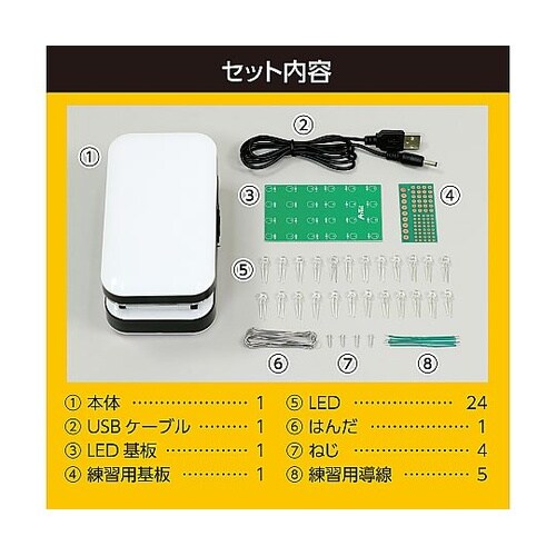 コンパクトに折りたためていつでもどこでも使える!!組立はライト部分だけなので制作が簡単な短時間教材!LED24球使用でとても明るく明るさが2段階に切り換えできる! |