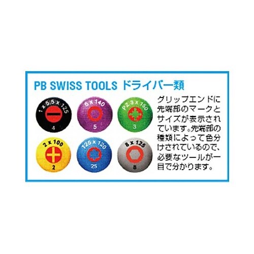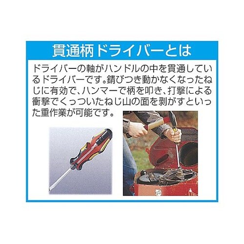 貫通柄の為、ハンマーでたたけます。打撃部分にはサイズの刻印入り。ドライバーの選別が容易です。手元六角付き手が濡れていても滑らないグリップ |