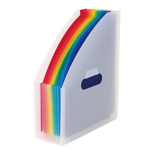 ボリュームに合わせて伸び縮みする12色のグラデーションが美しいレインボーカラーの収納スタンド。色別仕切りでさらに検索性を高めたドキュメントスタンド。A4クリアファイルがそのまま入るゆったりワイド設計。 |