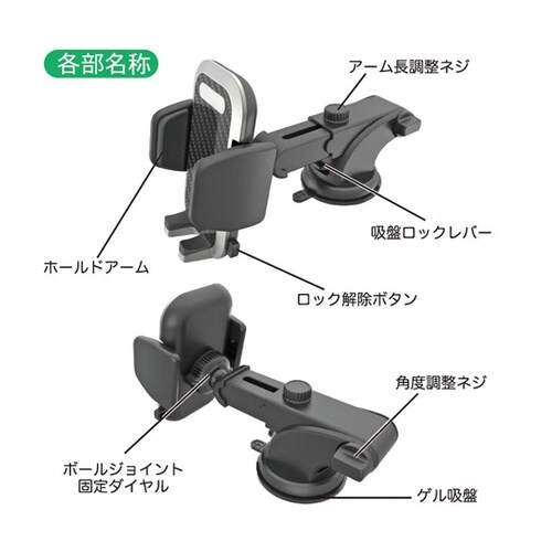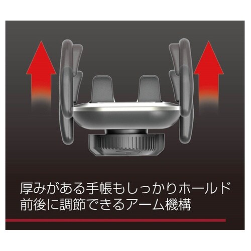 可動アームで取り回し自在の吸盤式スマートフォンホルダー。約12mm前後に可動するアームで手帳カバーもしっかりホールド。ゲル吸盤式のベースでしっかりと取り付けが可能。前後のスライドで最大で約45mm延長 |