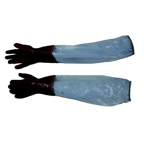 特殊溶着加工で手袋部分と腕カバーを溶着して一体化しているため、水が入らず、汚れ・水を伴う作業に適しています。塩化ビニール製のため、天然ゴムの手袋に比べて油に強い手袋です。裏布に13ゲージの編手を使用し |