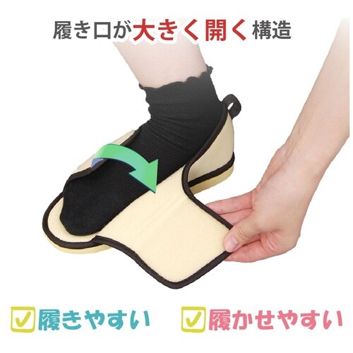 ちょっとした段差や滑りやすい床での転倒予防に配慮したシューズです。脱ぎ履きがしやすい面ファスナー式です。つま先なしタイプです。