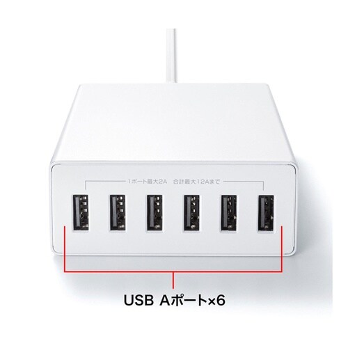最大6台のスマートフォンやタブレットなどをまとめて充電できる、合計最大出力12Aに対応した高出力タイプのUSB充電器です。USB出力は1ポートあたり最大2Aまで対応しており、最大6台のUSB充電対応機 |