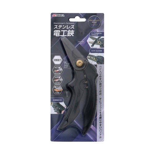 ケーブルの被覆はがし、銅板、アルミ板の切断にケーブルを逃がさないギザ&丸刃力が入りやすくフィットする握りやすいハンドル端子の圧着やワイヤー(−3.0mm以下)もカットできるセーフティコード取付け穴付き |