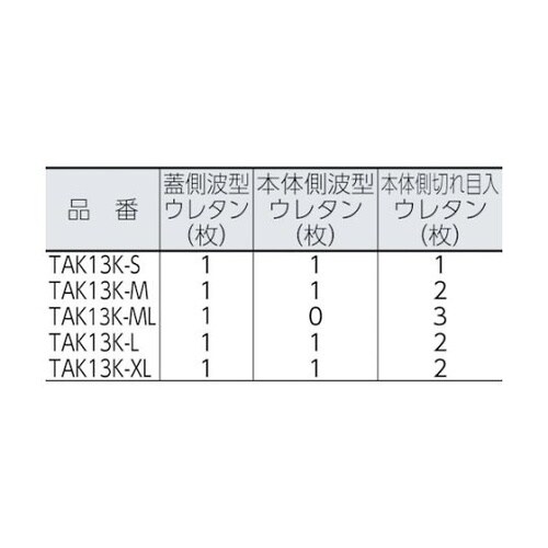波型ウレタン(軟質)と切れ目入ウレタン(硬質)の緩衝材が収納物を衝撃からしっかりガードします。切れ目入ウレタンは収納物に合わせて抜き形状を簡単に作ることが可能です。 |
