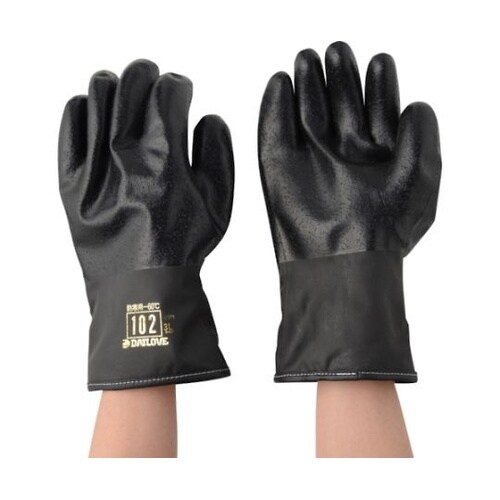 −60℃環境下でも硬くならないポリウレタンを使用した防寒用手袋です。ダイローブ102の黒タイプです。熱湯でも樹脂の軟化や硬化はありません。表面粒子で滑りに強く、インナーがボアになっているので高い保温性