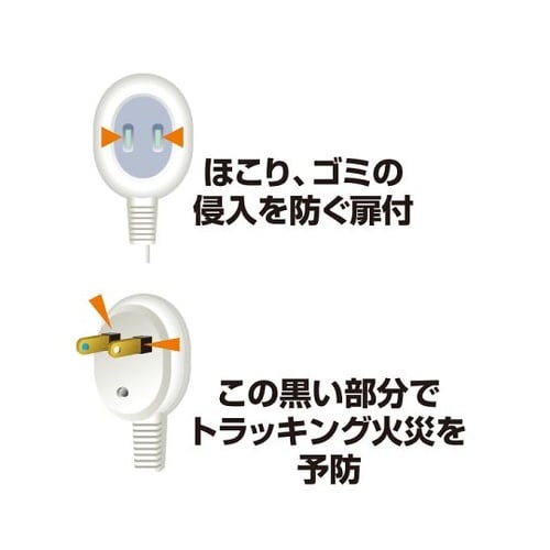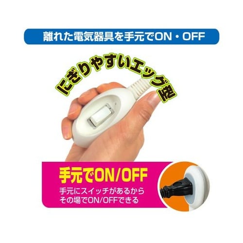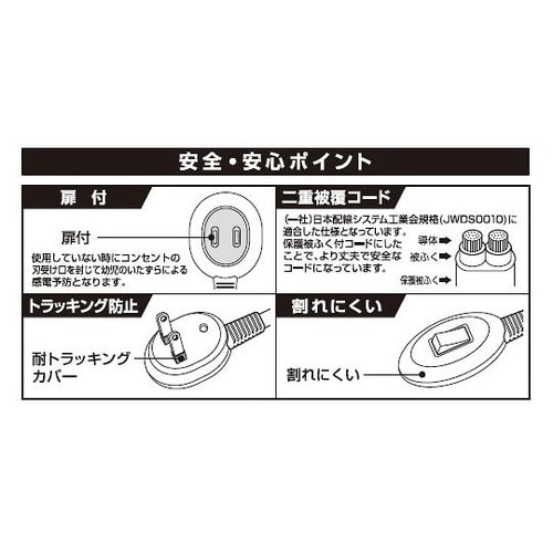 手元にスイッチがあるから、その場でON/OFFができる。ほこり、ゴミの侵入を防ぐ扉付。耐トラッキングカバー。よじれにくいだ円形状コード。 |