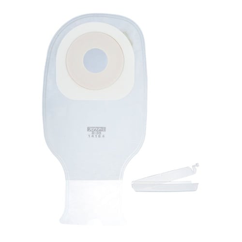 消化管ストーマ用。全体が平らな面板で。高さのあるストーマに適しています。下部に便排出口があるストーマ袋です。交換目安は3−5日。面板周囲のテープが、入浴時の皮膚保護剤周囲の溶けを防ぎます。