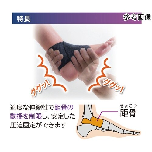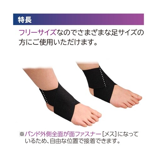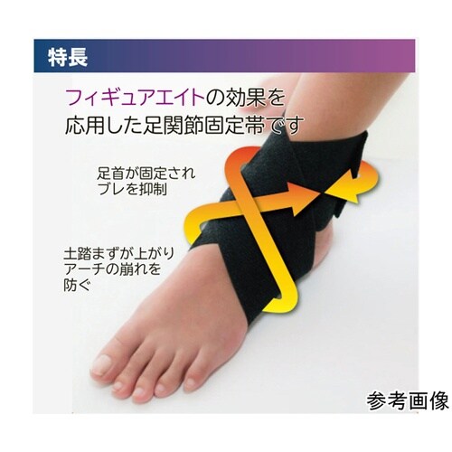 足首の安定した圧迫固定に。フィギュアエイトの効果を応用。適度な伸縮性で足首をしっかり固定、重心がブレにくい。面ファスナー接着で着脱簡単、左右兼用。