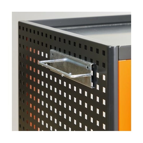パンチングパネルに取り付けて、各種工具を整理・整頓するのに適しています。パンチングパネル付の部品管理ラックやツールワゴンなどに取り付けるのが、有効です。パネルにフックをかけ、付属のねじを締めていただく |