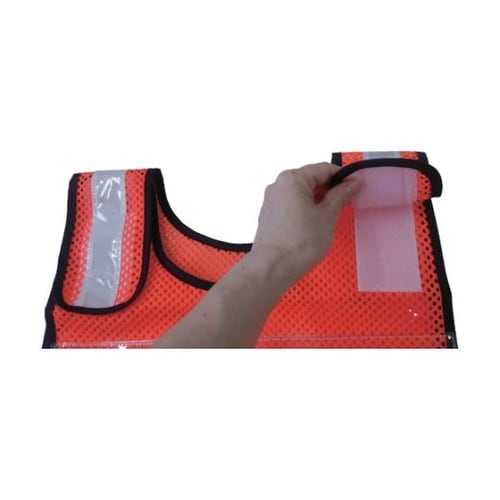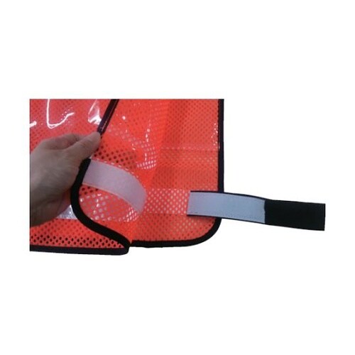 マジックテープ式のテープにて肩・胴まわりのサイズ調整が可能です。メッシュ生地で通気性が良いです。差し込み口のファスナーが下向きですので水が入りません。A4用紙が前後両面入ります。防災・保安パトロール。
