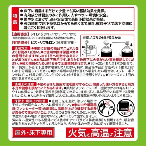 床下に噴霧してシロアリの被害を予防するエアゾール。有効成分は昆虫にだけ作用するので、人畜に安全です。有効期間は約1年間持続します。屋外・床下専用。シロアリ床下予防剤。床下に噴霧するだけで少量でも高い駆 |