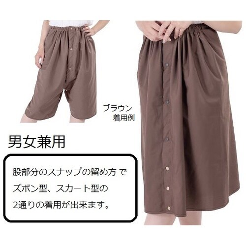 防水素材を内側に縫い付けた履く防水シーツです。股部分のスナップの留め方次第で、ズボン型、スカート型の2通りの着用が出来ます。見かけ自然なアウターとして、履いたままの安心した生活もできます。ボタンの留め |