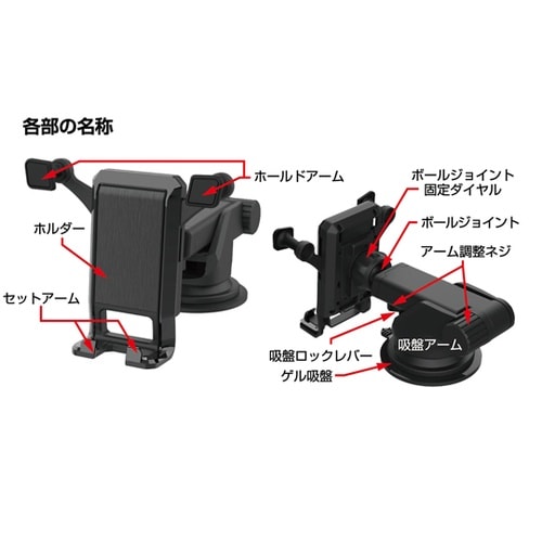 スマートフォンを置くだけでアームが閉じる、吸盤式ホルダー。ホルダーはそのままで、縦置き/横置き両方に対応。スマホのホールド/取り出しは片手で簡単。ボールジョイントで360度角度調整が可能。アームの長さ |