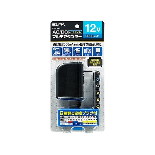 スイッチング式家庭用コンセント(AC100V)をDC12Vの電圧に変換安定化回路内蔵で、電圧変動が少なく機器にやさしい高容量2000mA、様々な機器に対応する6種類の変換プラグ付き |