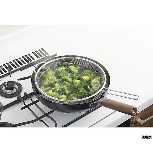 パスタや野菜などを茹でるときに揚げ物をするときにフライパンで茹でて、そのまま水切りできるサビに強い18ー8ステンレス |