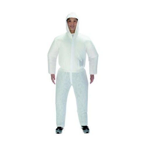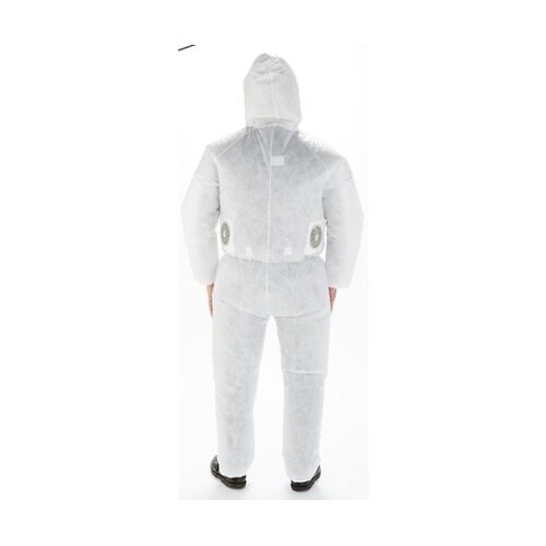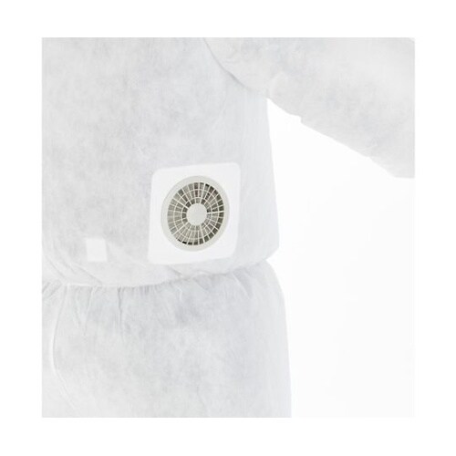 空調服[[R下]]のファンが取り付け可能な使い捨て保護服です。ポリプロピレン(PP)スパンボンド不織布の上にフィルムラミネートを施し、防水性に優れています。「空調服」は(株)セフト研究所・(株)空調服 |