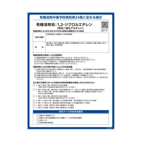 日本緑十字社 有機溶剤標識 1,2−ジクロルエチレン(ニ塩化アセチレン)RAE−501 600×450mm PP 412501 A04G-0930