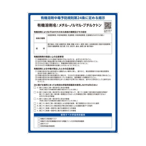 労働安全衛生規則等の一部を改正する省令に基づいた標識です。有機溶剤名、疾病の種類、症状の記載ありタイプです。