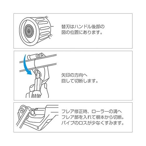 ステンレスパイプも銅管もきれいにカット刃は入念な熱処理を施した特殊鋼です。ボディはアルミ合金製ですので、軽快に作業ができます。面取り用ブレード付 |