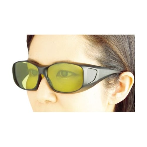 YAGレーザー用です。可視光線透過率が64%(平均)あり視界は明るいです。周辺光が入りにくいオーバーグラスタイプです。メガネあり・なしのどちらも違和感なく着用できます。ヤグレーザー機器取扱い作業者用。 |