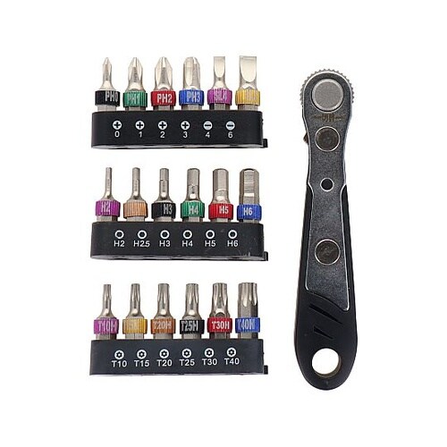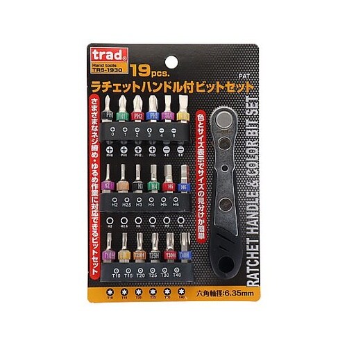 カラーとサイズ表記でビットの番手の見分けができる。あらゆるネジ締・緩め作業に適応したラチェットハンドル付のビットセット |