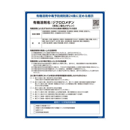 労働安全衛生規則等の一部を改正する省令に基づいた標識です。有機溶剤名、疾病の種類、症状の記載ありタイプです。