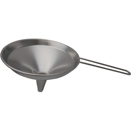 扱いやすいハンドルのついたじょうご(ロート)です。先端口は液体がスムーズに下に落るよう、ハート形の段押し加工を施しております。本体ハンドル共に18−8ステンレスを使用しており、錆に強くとても衛生的です