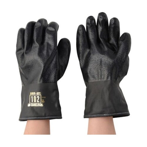 −60℃環境下でも硬くならないポリウレタンを使用した防寒用手袋です。ダイローブ102の黒タイプです。熱湯でも樹脂の軟化や硬化はありません。表面粒子で滑りに強く、インナーがボアになっているので高い保温性 |