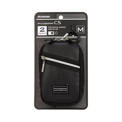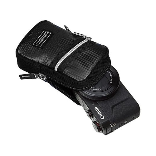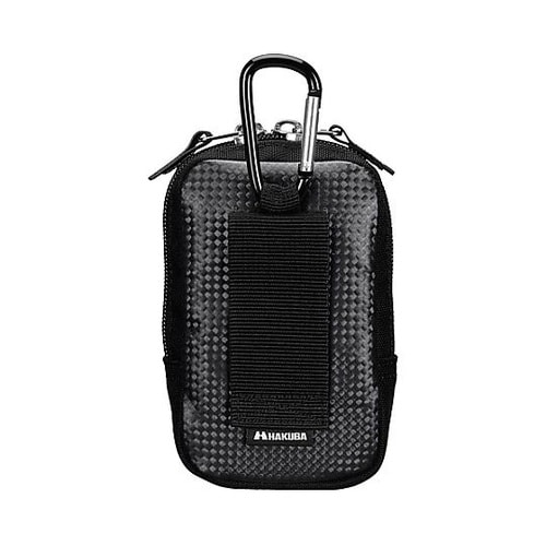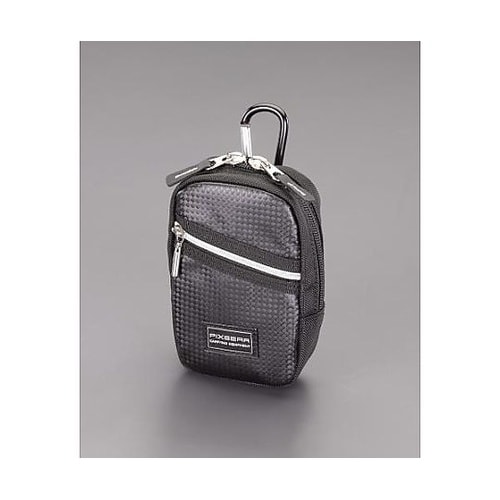 表生地にカーボン調ポリウレタン素材を使用したカメラポーチです。フロントポケットはメディアカードなどのアクセサリー類の収納に最適です。背面には持ち運びに便利なカラビナやベルト通しが付いています。 |