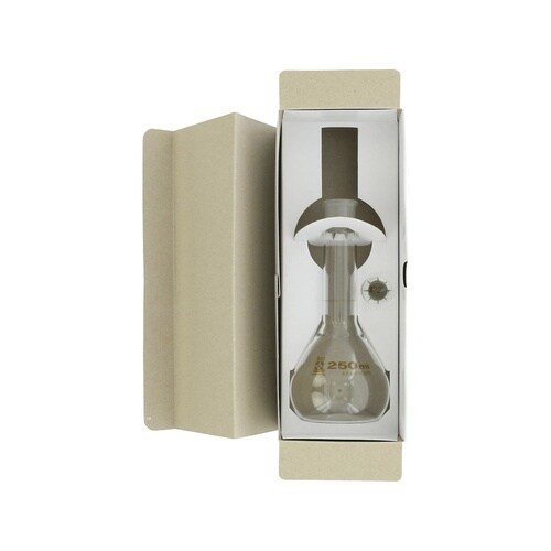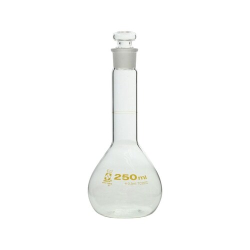 一定の体積を測るために用いられます。全量フラスコとも呼ばれます。底の平らなフラスコに細長い首が伸びた形状で、首の部分に通常は1本の回線があります。目盛のある首部分の径が細いため、同容量のメスシリンダー |