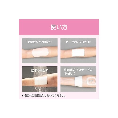 水蒸気透過性・粘着性にすぐれ、むれにくく剥がれにくい。皮膚も角質をほとんど剥がさず、かぶれ・かゆみを抑えます。防水性があります。 |